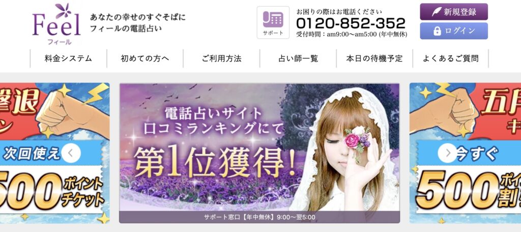6位電話占いフィール1分200円~最大3,000円分無料メール鑑定対応/女性占い師多数在籍