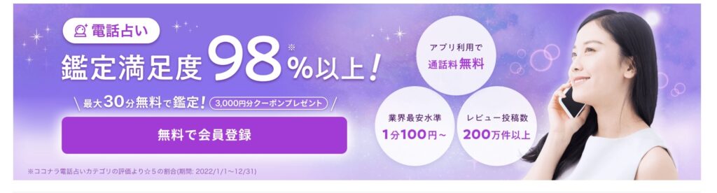 4位ココナラ電話占い1分108円~最大3,000円分無料クーポン利用者レビュー豊富/低価格でお試ししやすい