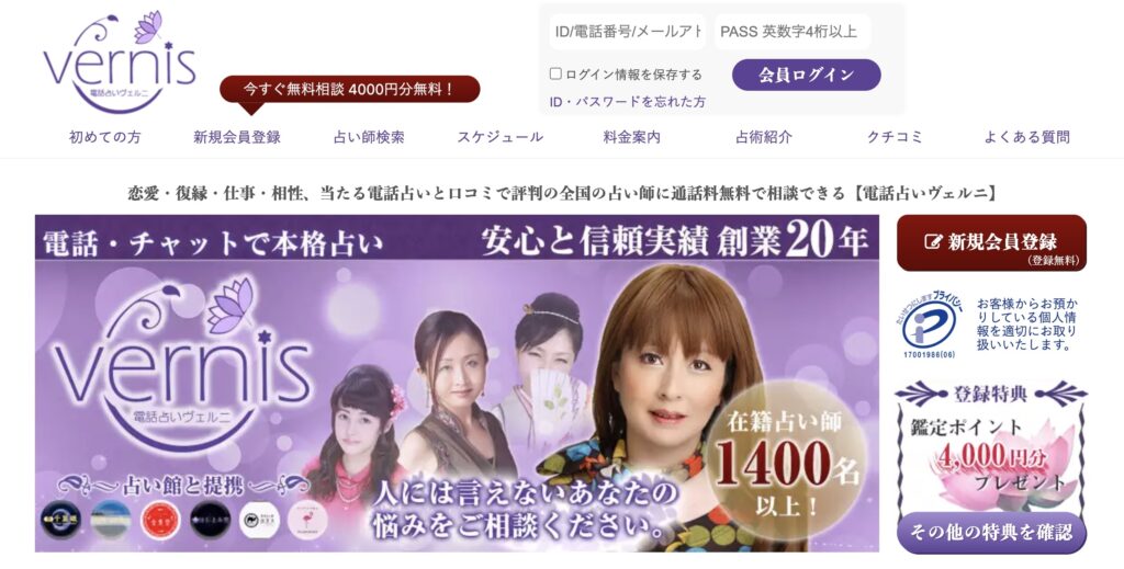 3位電話占いヴェルニ1分230円~最大4,000円分無料占い師数750名以上/メール鑑定可